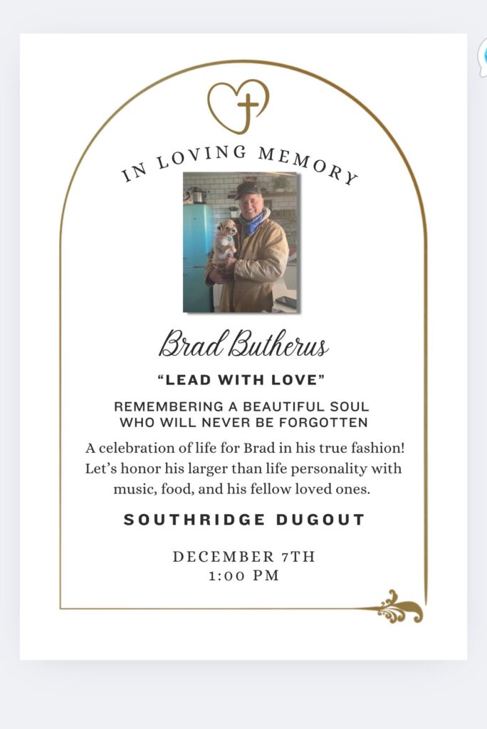 Special Events Next Event Celebration of Brad at Southridge Dugout - - - Chelsey - - 1:00 pm - 5:00 pm See All Description Upcoming Events Celebration of Brad at Southridge Dugout - December 7, 2025 - 1:00 pm - 5:00 pm