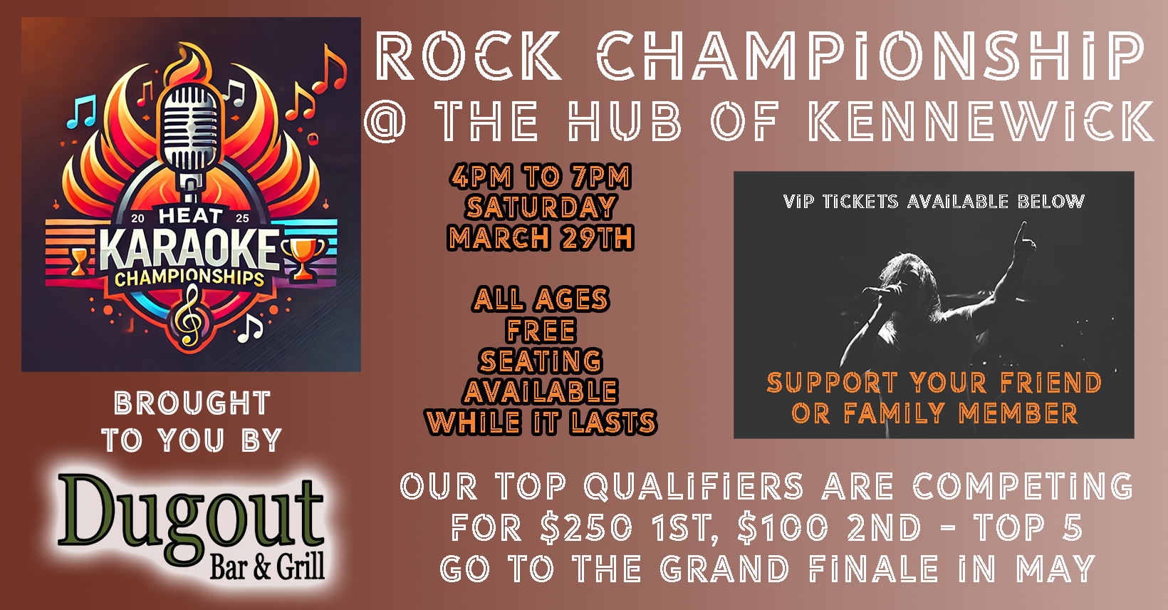 🏆 The Rock Champion will take home a trophy and $250 in cash, while the runner-up earns $100. In addition, three more performers will advance to the Grand Finale in May, where they’ll compete for the ultimate $1,000 grand prize, $500 for second place, and $100 for third place.